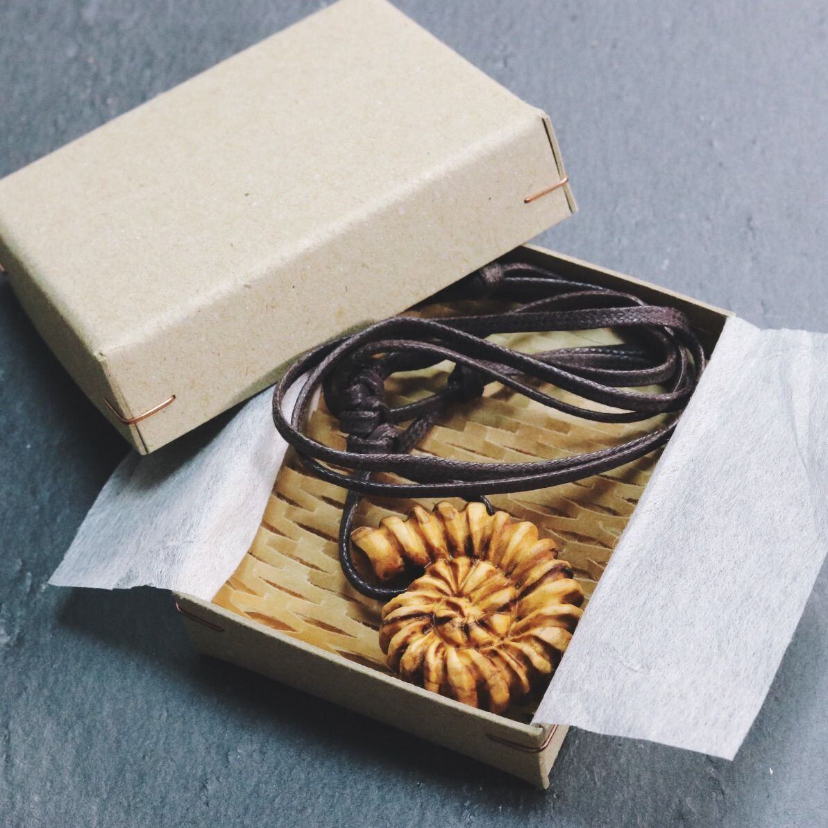 古生物「アンモナイト」の化石をモチーフに、「オリーブウッド」という樹種を削り出してペンダントを制作しました。